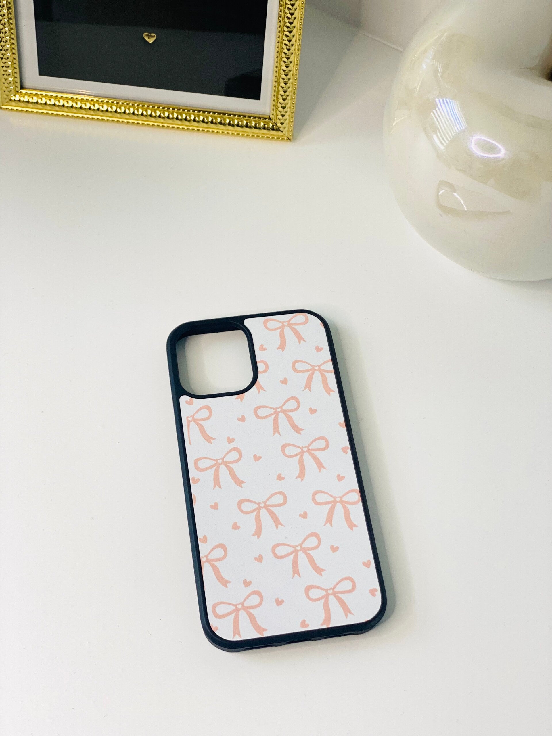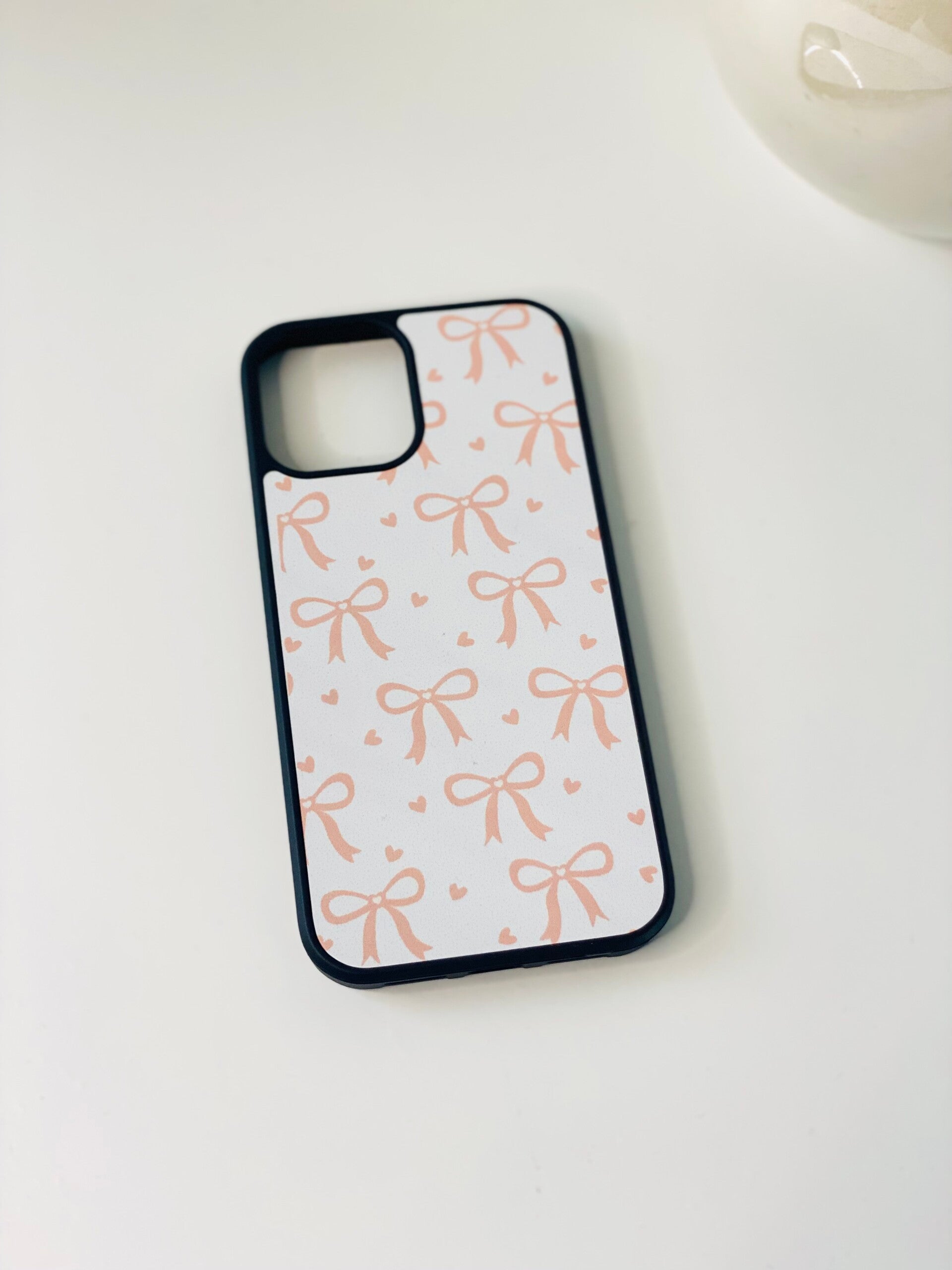Dit iPhone hoesje is versierd met een speels strikjespatroon en gemaakt met sublimatie-inkt. Door een kleine fout met het plakband tijdens het drukproces kunnen er lichte drukfoutjes zichtbaar zijn.