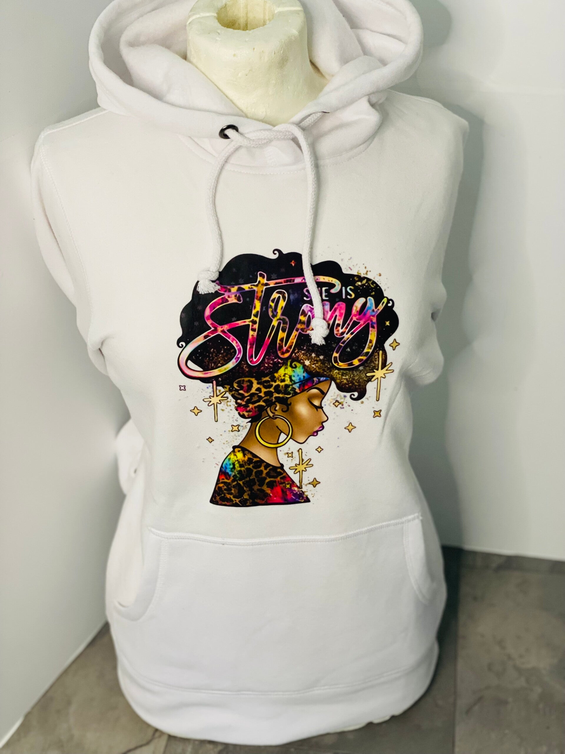 Deze exclusieve hoodie/tanktop/t-shirt is een ode aan vrouwelijke kracht en identiteit. Het DTF-design toont een krachtige Black woman met een stralende uitstraling en kleurrijke details. De tekst “STRONG, ROOTED & RADIANT” benadrukt innerlijke kracht, verbondenheid met je oorsprong en de energie waarmee je de wereld in stapt.