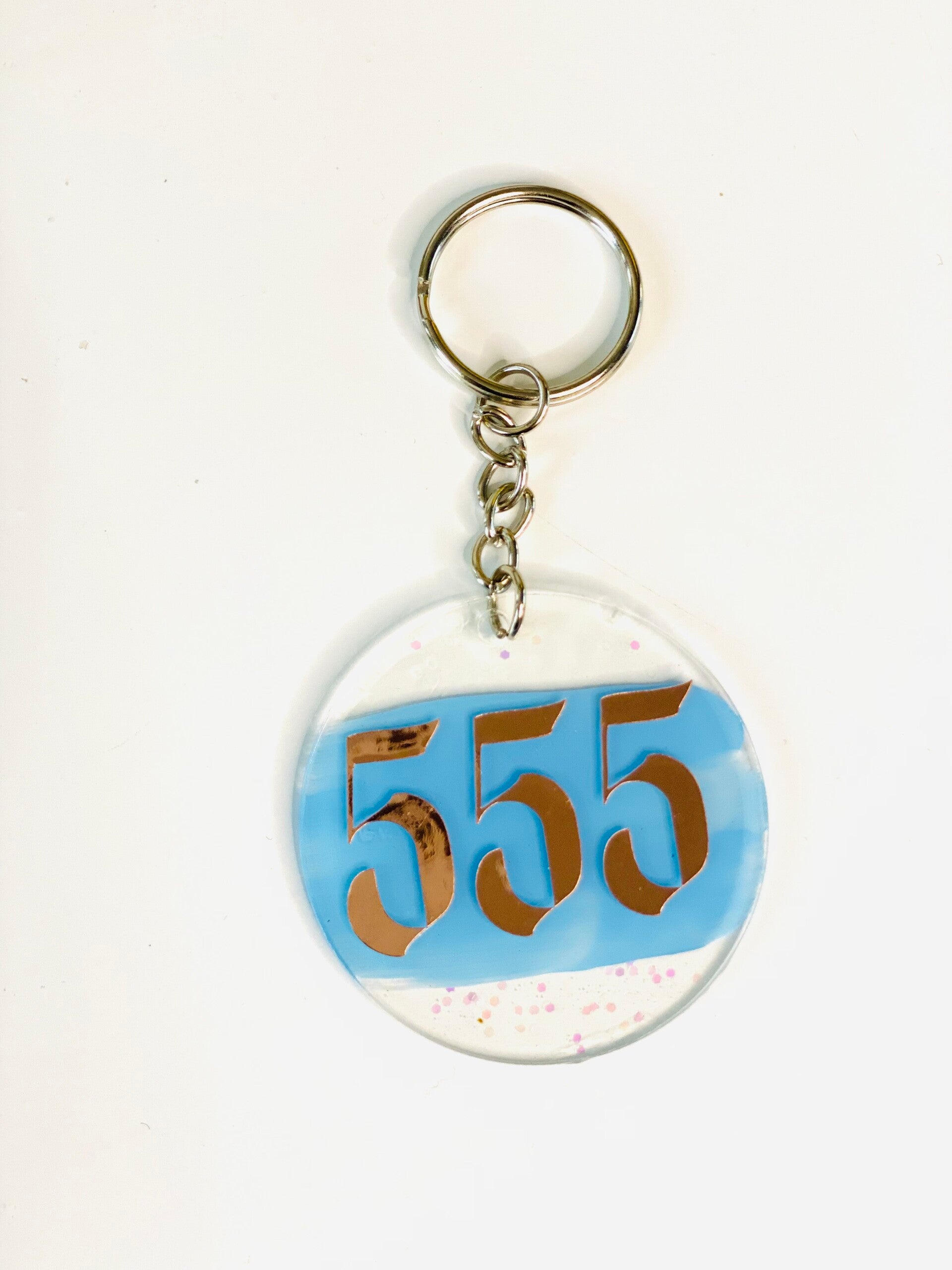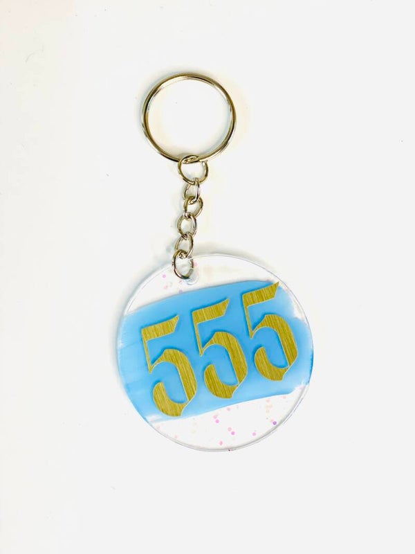 Ronde Sleutelhanger met Beschermengel – Naam in Vinyl – Nummer 555