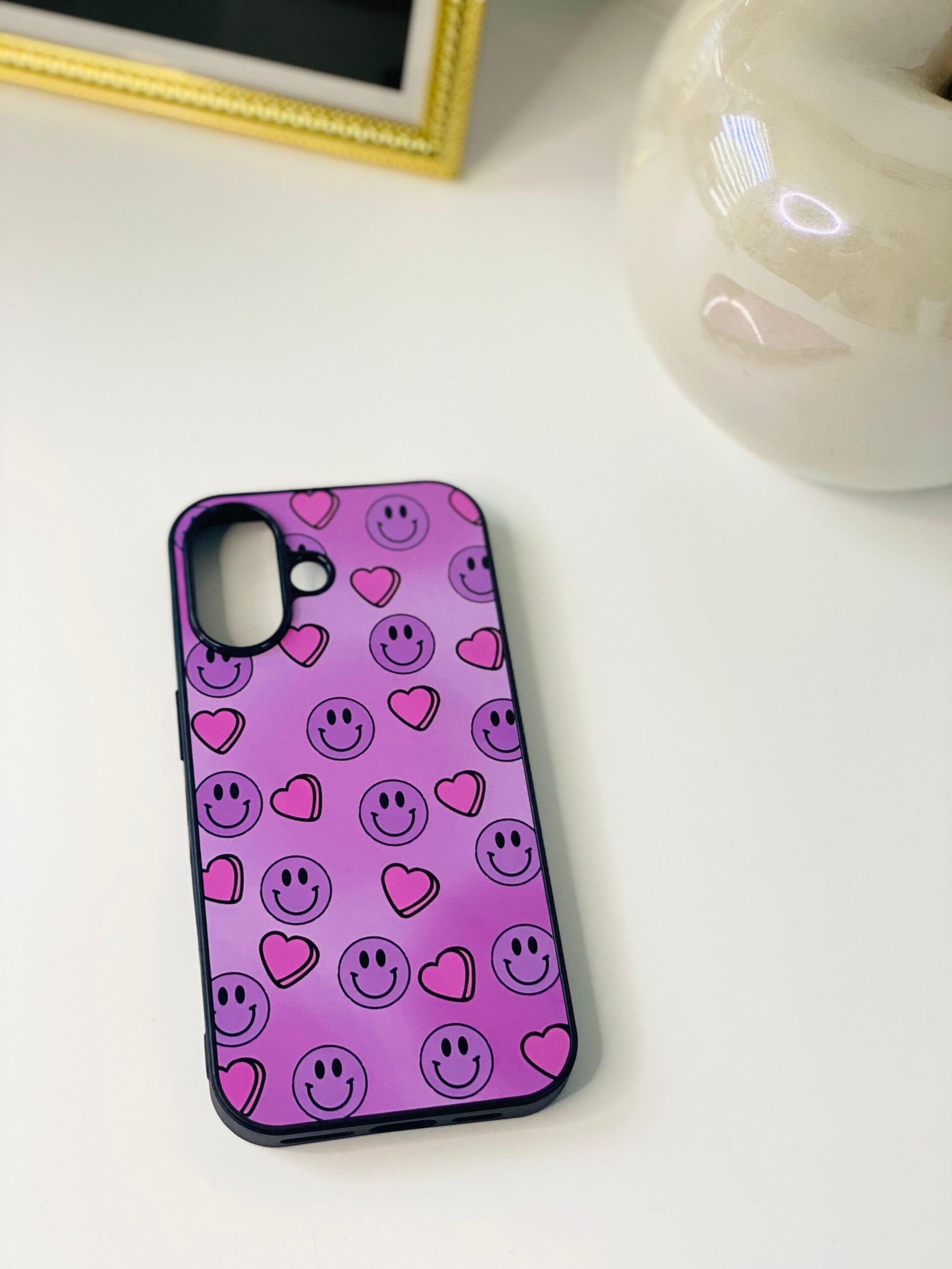 Dit vrolijke iPhone-hoesje is bedrukt met paarse smiley’s en hartjes, en straalt positiviteit uit! Het is gemaakt met sublimatie-inkt. Tijdens het drukken is het plakband niet helemaal goed geplaatst, waardoor er kleine foutjes in de opdruk kunnen zitten.
