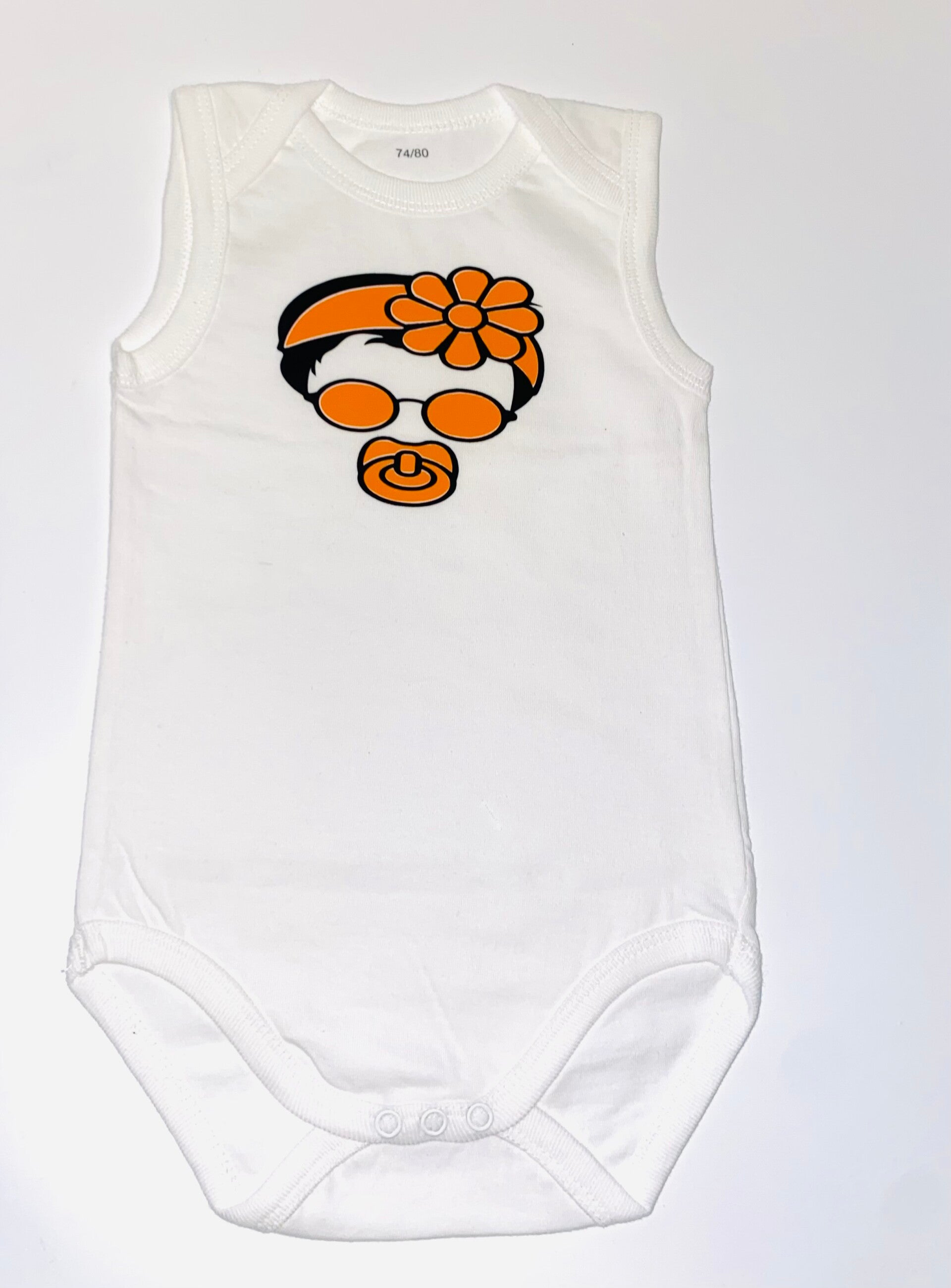 Unieke romper met een vrolijk cartoon-babygezichtje inclusief speen, zonnebril en bloemstrikje. Opvallend oranje design op zacht wit katoen. Maat 74/80 – perfect als origineel kraamcadeau!