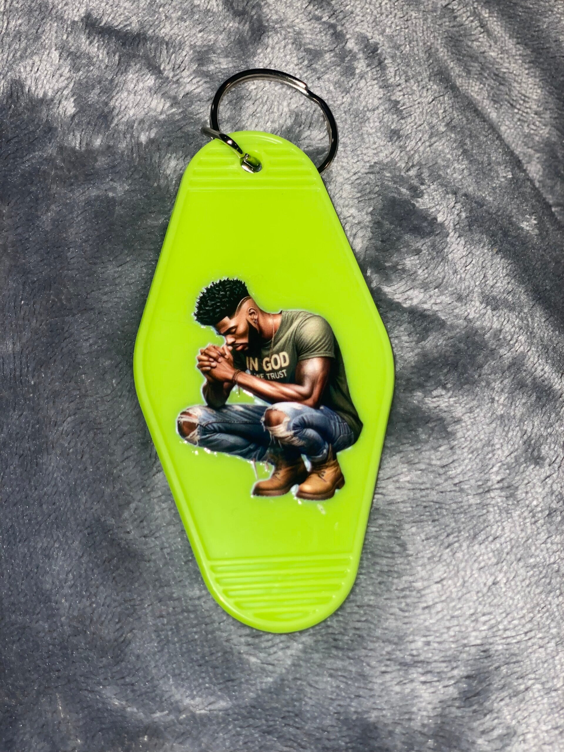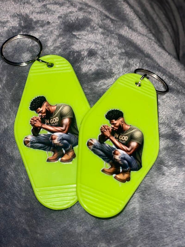 Retro Motel Sleutelhanger met Biddende Zwarte Man – DTF Print – Spiritueel & Krachtig Accessoire