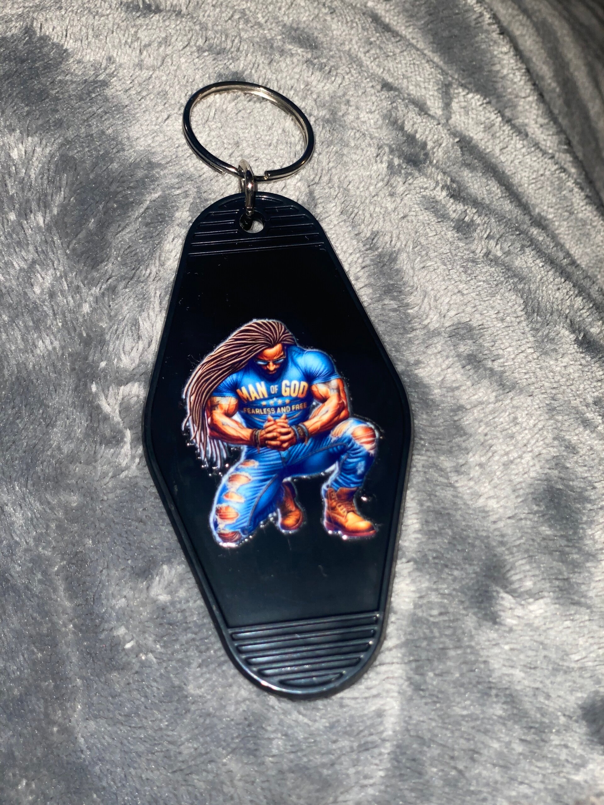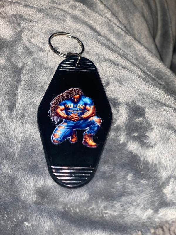Retro Motel Sleutelhanger met Biddende Zwarte Man – DTF Print – Spiritueel & Krachtig Accessoire
