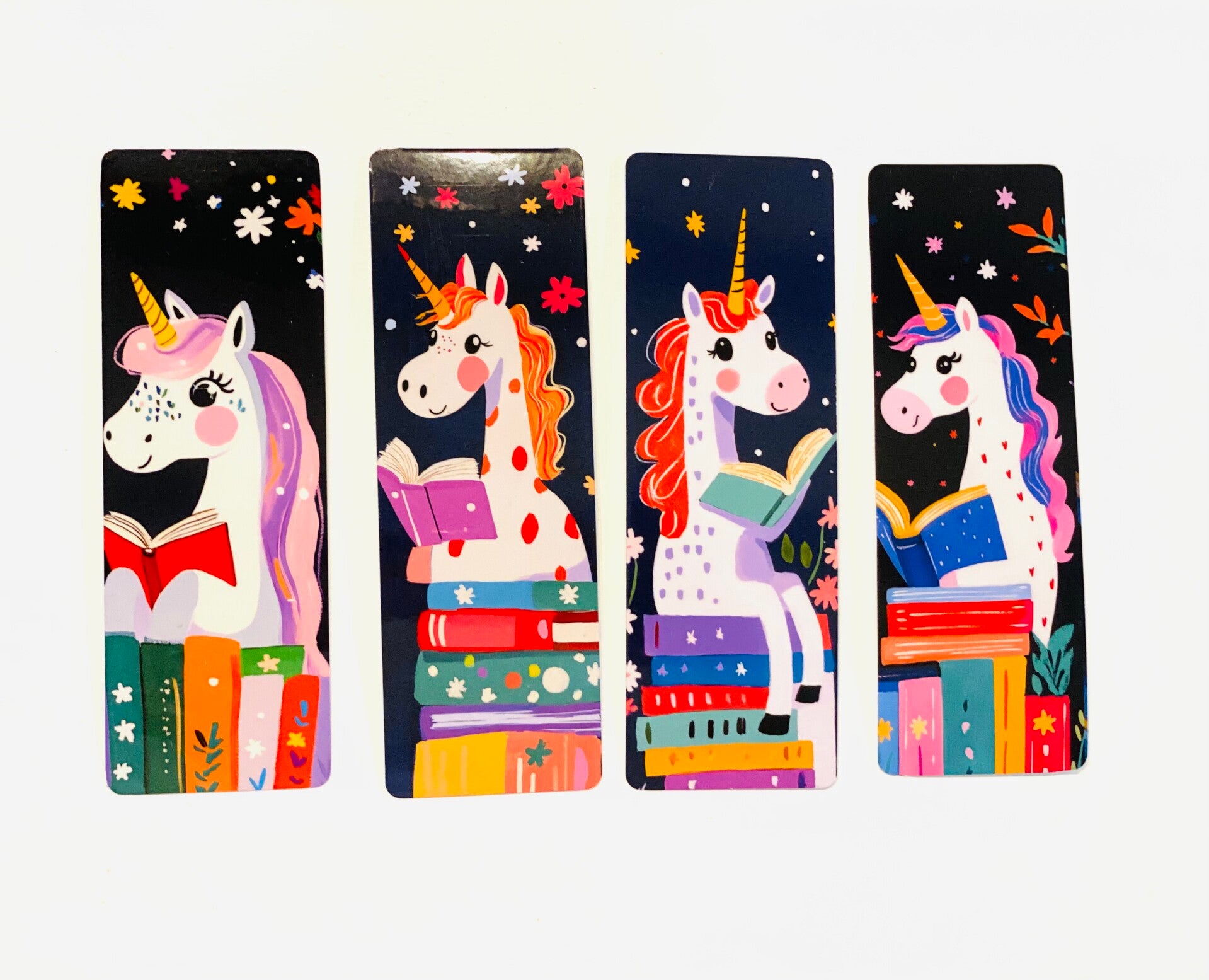 Breng een vleugje magie in elk leesmoment met deze set van 4 gelamineerde unicorn bladwijzers. De speelse unicorn-illustraties in zachte en vrolijke kleuren maken lezen extra leuk voor kinderen, maar zijn ook geliefd bij volwassenen die houden van een magische touch.